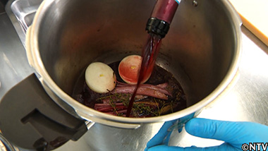 臭みを取ったハブの身を圧力鍋に入れ、ワインと共に煮込む。 |