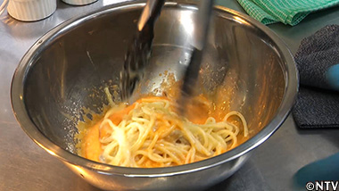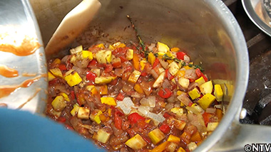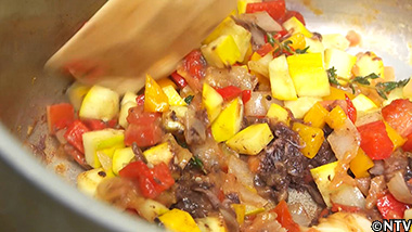 パプリカ、ナス、ズッキーニ、トマトと共に、ほぐしたハブの身を炒める。 |