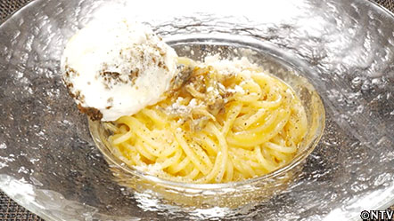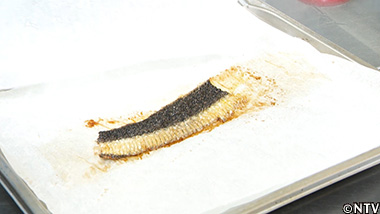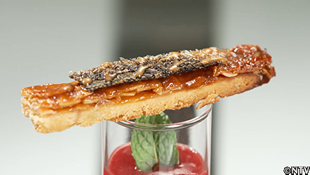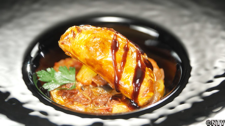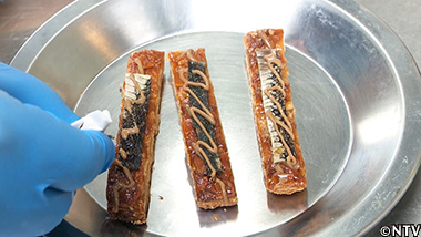 オーブンで焼き上げたハブの皮をサブレフロランタンに乗せ、キャラメルソースを絡める。 |