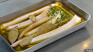 ブランデーに漬け置いたハブの身にエキストラバージンオイル、ニンニク、ローレル、タイムを加え、100度のオーブンでコンフィに。 |
