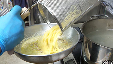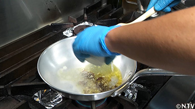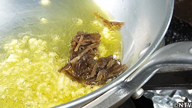 ハブオイルにニンニク、ほぐしたハブの肉を入れる。 |