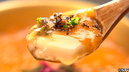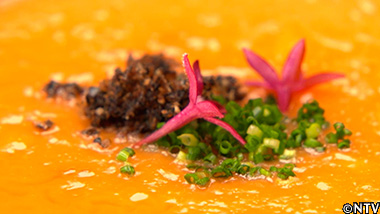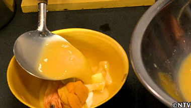 (4)エビ、百合根、ぎんなん、生ウニに先ほどの汁を加え、86度の低温でじっくり蒸す。 |