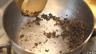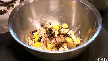 (2)素揚げしたキイロスズメバチの成虫を砕いて混ぜ合わせる。 |