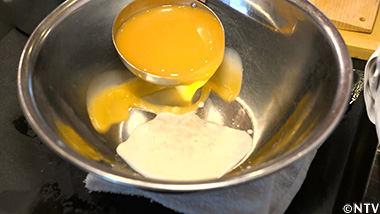 (3)塩茹でした蜂の子を裏ごしし、そこに卵と出汁を加える。 |