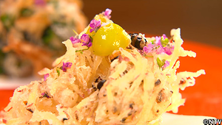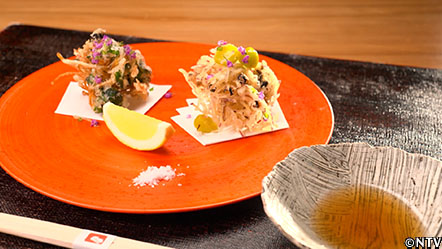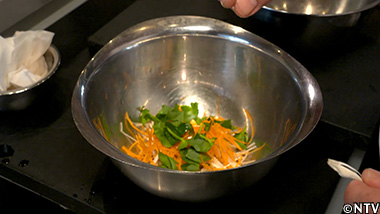 (1)根菜(ごぼう、にんじん、さつまいも)、きのこ(まいたけ、しめじ)、銀杏を混ぜ合わせ、アクセントにみつば、ミョウガを加える。 |