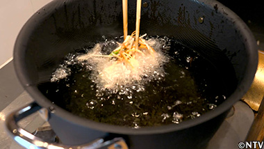 (3)衣で具材をまとめ、1分ほど揚げる。 |