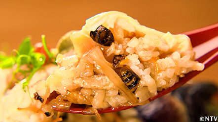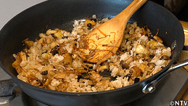(3)スズメバチの佃煮とご飯を加えさらに炒める。 |