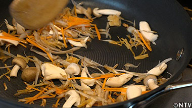 (2)ごぼう、にんじん、しめじ、帆立の貝柱、オキアミを合わせ炒める。 |