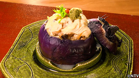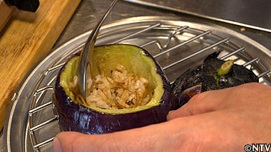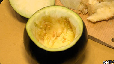 (4)丸茄子をくりぬき、素揚げにする。 |