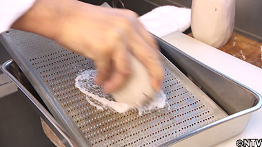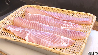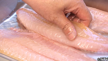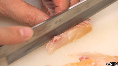 (2)20分置き、淡白な身に旨味を染み込ませたら、本来の弾力を活かすため、繊維に沿って切る。 |