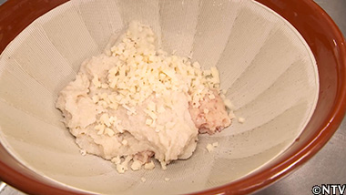 (4)ミンチにしたアメリカナマズのすり身と合わせ、刻んだレンコン・下味の醤油・片栗粉を混ぜ合わせる。 |