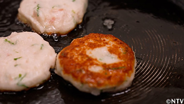 (5)仕上げに臭み消しの大葉を入れて焼き色をつける。 |