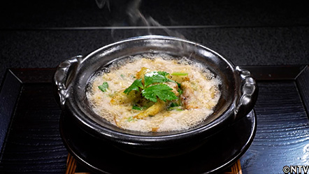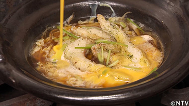 (6)アメリカナマズの泥臭さと相性がいい、ごぼうと煮込み、最後に、溶き卵でとじる。 |