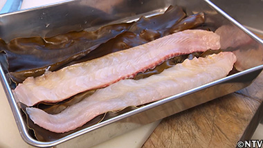 (1)下処理をしたアメリカナマズの身を、昆布締めに。 |