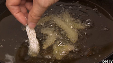 (3)片栗粉に臭み消しとして青のりをたっぷり混ぜた衣をつけ、180度の高温で1分。磯辺揚げ風に。 |