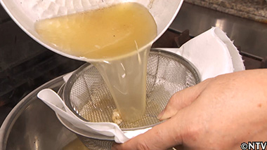 (5)焼いたアメリカナマズの骨、ネギ、昆布と煮た出汁をこし、醤油、味醂で味をつける。 |
