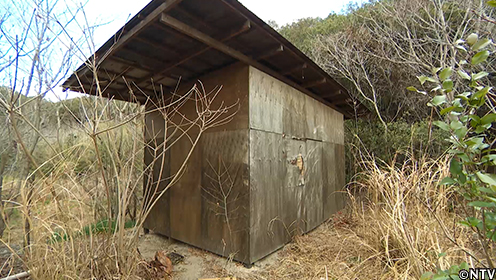 東側の浜から入ってすぐの平地エリアにある、古びた小屋。