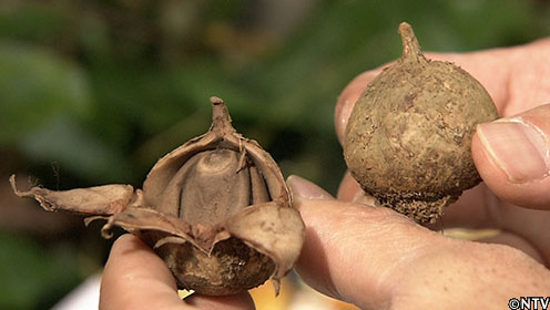 一見すると、自然薯の種芋にもなるムカゴにも似ているが、キノコの仲間。 別名は「地上の星」と言われ、その理由は、生えたての幼体は、丸く玉ねぎのような形をしているが、成長と共に表面の皮が星型に裂けるため。 袋の中に、キノコの種にあたる胞子を溜め込み、雨つぶなどの刺激を利用して撒き散らす。