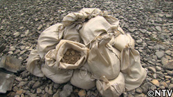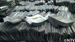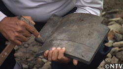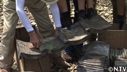 屋根の上に土を載せ、その上に瓦を1枚ずつ押さえ付けて固定していく。 |