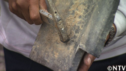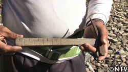始めに葺く1列目の瓦は、全体の位置を左右しかねないため、柄の部分に目盛りの付いた金槌で、軒からの距離を測りながら、瓦に開けた穴と打ち付けた竹ひごに番線を通して固定する。 |