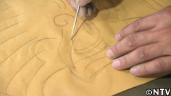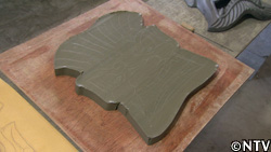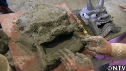 眉毛、おでこ、目、鼻、アゴと、顔のパーツの盛り付けをしていき、原型ができたら、“金ベラ"という道具で表面の凸凹をならしていく。 |