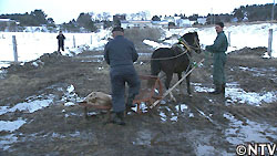 馬につないだロープに引かれて雪の上を滑る「馬スキー」。 冬場の馬の運動不足解消を目的に昭和初期に始まった雪国独特のトレーニング法。馬に馬車をかける前に、後方のものに慣れさせる訓練としても取り入れられている。