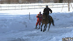 馬につないだロープに引かれて雪の上を滑る「馬スキー」。 冬場の馬の運動不足解消を目的に昭和初期に始まった雪国独特のトレーニング法。馬に馬車をかける前に、後方のものに慣れさせる訓練としても取り入れられている。