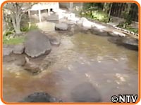 | 気温4℃の寒空の中、88℃の源泉を水で冷ます城島。 45℃と普通ではかなり熱めの湯に強引に入り、何とかゲットすることができた。 |