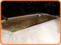 | 「寒いですよ」という宿の方にお願いして、特別にお湯を出してもらったが、出てくる湯の量が少ない…。 何とかアヒル隊長に浸かってもらってゲット。 |