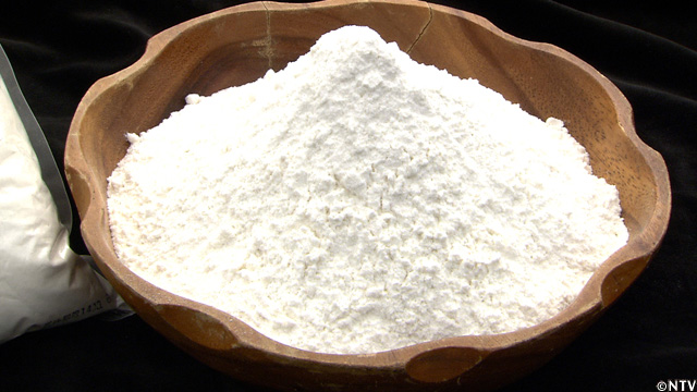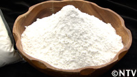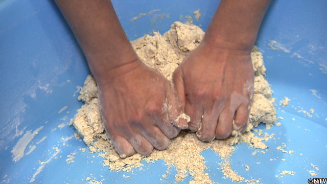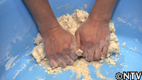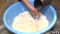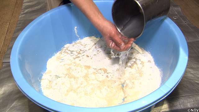 かん水を『春よ恋』に加え、細かい玉をいくつも作って均等に水分を行き渡らせる。