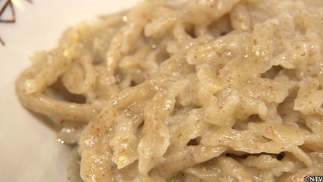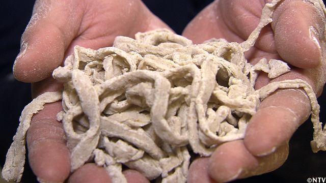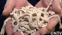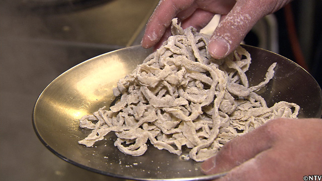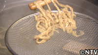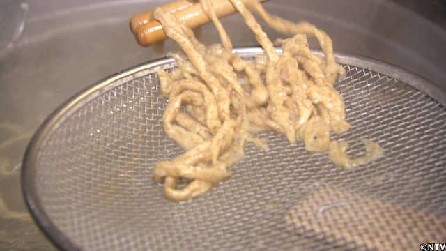北海道の最高級小麦『春よ恋』を使い、今回作った試作第1号は、パンチ力のあるTOKIOの出汁スープにも負けずによく絡み、『春よ恋』の風味を損なわない、手揉み縮れ麺。