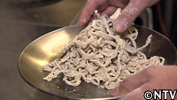 麺切りした麺を、上から潰すように揉む「揉み」、両手で握るように揉む「両手揉み」、さらに片手で持ち、片手で揉む「片手揉み」の3種類の揉み方で、麺に縮れをつけていく。