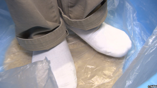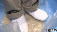 固くなり、手で捏ねられなくなった生地を、足を使って、体重をかけて伸ばしていく。