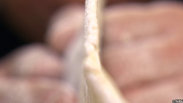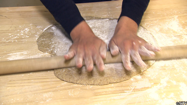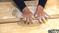 ある程度延びたら、麺棒を使い、体重を真上からかけるように延ばしていく。