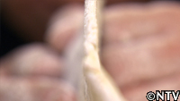 そして、手で、生地をよく捏ねていく。元々、コシの強い『春よ恋』と、強いコシを生むかん水の相乗効果でどんどん固くなっていく。