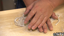 延ばした麺は、いよいよ麺切りし、揉む作業へ。 |