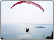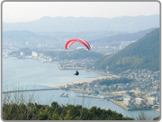 玉野市にある王子が岳は、海から駆け上がった標高234メートルの小高い山。高さはそれほどでもないものの、海へと一気に下る斜面は、海からの風も相まってパラグライダーのメッカとなっている。