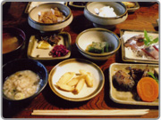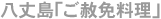 ご赦免料理とは、赦免になり本土へ戻る流人を祝うため作られたとされる。島で採れる明日葉、かんも(サツマイモ)、海苔などの食材を使った料理が彩り良く並べられる。