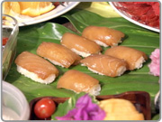 その宴会でも良く持ち寄られるのが島寿司。 島ではワサビが手に入らない事から「カラシ」が使われている。 カラシによる防腐効果で高温多湿な環境でも腐りにくい。 また、製糖が盛んだった影響から、父島のものより甘口の味付けである。