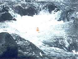 今回の実験の舞台となるのは、静岡県・伊豆半島の中心部にある天城連山から流れる河津川(かわづがわ)。この川の源流からスタートし、川と山道と分かれ、一気に海との合流地点である、河津川河口の浜橋を目指す!! 川ルートを行くのは、アヒル隊長。小柄な体ながら、今までにも過酷な川下りに挑んできたアヒル隊長。前回は冷たい雪解け水が流れる富山県の黒部川に挑戦し、21時間かけて、全長50kmの行程を見事流れきった。 そして今回、アヒル隊長は、松岡と長瀬に見守られながら、海までの全長約14kmの川下りに挑戦。 一方、山道を下り、アヒル隊長に戦いを挑むのはマウンテンバイク男こと山口達也。鹿児島では薩摩半島を横切る近道を探して、草木の生い茂る山道を無事完走した経験を持つ。 今回、達也は直線距離にして約9kmの山道を下り、海を目指す。川よりも距離は短いが、途中には急勾配のアップダウンもあり、かなりの道のりになりそう。 この山下り対決、「川」を下るアヒル隊長が勝つのか、それとも「山道」を下るマウンテンバイク男こと達也が勝つのか!? この対決の日は、あいにくの大雨。 正午に海抜1020mの河津川源流から、アヒル隊長・マウンテンバイク山口、両者同時にスタート!! 雨でぬかるんだ道を進まなければならない達也。一方のアヒル隊長は、雨のために水かさが増した川を下りはじめた。 コースの序盤、山道ルートはアップダウンの激しい道が多く、達也、思うようにスピードが出せない。 一方、川ルートのアヒル隊長は川幅が狭く石の多い川を、石の間を上手くすり抜け、流れに乗ることに成功!! 達也の行く山道は、折からの雨でぬかるみ、水溜りもできており、ハンドルをうまく操れない。加えて山下りとはいえ、起伏が激しい地形であるため、上りの山道にも直面する。 しかも、このあたりの区間は、人が一人通るのがやっとの細い道。泥だらけのタイヤはすべって空回りしてしまう。また、ぬかるみにタイヤがはまり足をついてしまうこともしばしば。この思わぬ難関に、ついに達也は、ひとまずペダルをこぐのを断念し、自転車を押して歩き出した。 そのころアヒル隊長は、雨で増した水かさが幸いし、急流ポイントも流れに乗って容易に通過。一直線に下るアヒル隊長を松岡と長瀬は、寒天橋で待つことに。 ところが、人間の思惑など我関せずのアヒル隊長。なかなか姿を現さない。すると!! そこへ黄色い姿が。隊長の無事な姿に安心する二人だが、よく見ると、ここまで順調に下ってきた隊長の様子がおかしい。近寄って見てみると… なんとアヒル隊長は、よどみにはまって身動きが取れなくなってしまっていたのだった。 そこで長瀬は、長靴を装着し川に入り、助けに向かい、網でアヒル隊長をすくって救出に成功。ただ、ここ河津川には大小七つの滝があり、この先には、滝が連続するという激流ポイントがあるという。果たして、勇敢なアヒル隊長は、この難関に耐えられるのか? その頃、達也は下りに入ったのであったが、やはり雨のため、走りにくさはぬぐえないまま。しかも、階段や上りなども度々あり、一進一退が続く。 スタートから一時間半。マウンテンバイク、アヒルちゃんともに自然の厳しさに直面。 さて、岩場をすり抜け、傾斜も急になり、いよいよ初めての滝が待っている。アヒル隊長が挑むこの滝は、「平滑滝(ひらなめのたき)」といい、落差は小さいものの急流にあるため勢いがあり、落下速度が速い。 松岡と長瀬、滝のそばでアヒル隊長の通過を待つ。すると、目の前のよどみには、誇らしげに浮かぶ隊長が。急流に乗って、目にもとまらぬ速さで見事に滝下りを成功させていたのだ。ただ、またも流れのないよどみにはまってしまって動かない。そこで、今度は松岡が救出に向かい、岩場へジャンプ。その時、松岡、ぬるぬるとした岩ですべり着地に失敗、足を負傷してしまう。 その後、松岡は、長瀬の治療の甲斐もあり、痛そうではあるが復活。そしてアヒル隊長も、この松岡の体を張った救出のおかげで、再び川を下り始めた。 登りの峠を越えた達也だが、下りは下りで運転には細心の注意が必要とされる。特に、この日はブレーキさばきも慎重にしなければならない。ところが、悪路に阻まれ達也、ついに転倒!!。しばらくは起き上がれず、痛がっている。しかし、アヒル隊長に負けるわけにはいかぬと気合を入れ、道なき道へペダルをこぎ出した。 その後も転倒を繰り返す達也だが、着実に距離を伸ばす。雨も小降りになり、道幅も広がり、展望が開けた。そこで、休憩所発見。 三時間に渡って自然がもたらした突然の悪路に挑戦しつづけた達也。さすがにここでは小休止。雨をしのいで「おむすび」をほおばる。 腹ごしらえをして、再びスタートした達也の前には、難関が降り続く雨のように次から次へと押し寄せていた。傾斜の急な細い道には進路をふさぐ倒木が!! さらに、今度は階段。 そんな難関も達也は身のこなしも軽や