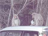 先生が泣き声でサルを威嚇し、銃を構える素振りを見せる。だが、サルは微動だにしない。さらに、サルは長い物に怯えるらしく音声マイクを向けてみるが、サルを逆撫でする一方。先生いわく、車を降りた時にドアを開けたまま離れたのが人間のミスだという。