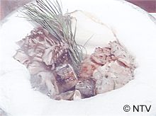 その頃、食材を待つ厨房は慌しくなってきた! 果たして、間に合うのか? タイムリミットまで残り1時間、伝統漁法の城島と太一、仕掛けておいたプラスチックのどうを持ち上げてみると、何かが動く気配…。そしてフタを開けてみると、ニジマスが入っていた! これで城島と太一は2種類目をゲット! 一方、湖の長瀬、釣れそうな雰囲気だが中々当たりが来ない。そして残り30分となり、辺りも薄暗くなってきた。ここでルアーからフライに変え、川へさらに踏み込む。 そして残り10分、城島と太一は残り時間でこれまでの仕掛けをすべてチェック。竹製のどうは…成果なし。続いて網のどうを持ち上げると…入っていた! しかも、狙っていた3種類目のヤマメ! これで伝統漁法チームは3種類揃った! 急いで厨房へ戻り、板長に渡して何とかタイムリミットに間に合った! 板さんによる宝楽焼の調理がはじまった! とれたてのイワナ・ヤマメ・ニジマスを三枚におろしてぶつ切りにし、これをミンチにして団子状に。そしておろした魚の残りは別に焼き上げる。メレンゲを塗りつけた鍋に、マイタケやシイタケなどと一緒に魚も盛ってオーブンで焼くと、群馬・薬師温泉名物、川魚三種の「宝楽焼」が完成! 城島と太一が伝統漁法を駆使して捕った魚三種は、贅沢に織り成す幻の味。 いよいよお客様のもとへ。その反応が気になる城島と太一は陰から様子を見守る。「美味しい!」と言ってほころびるお客さんの表情に、「いい仕事ができてよかった!」と感激する城島。すると太一、「美味しいって…マイタケだったらどうする?」との心配に、城島は「それはマイッタけ」と返し、ダジャレも絶好調? こうして2人の1日仕事が終わった! ところで、釣り師・長瀬はというと、タイムリミットをとっくに過ぎても、時間を忘れ湖で静かに戦っていた! |