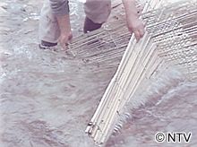 ![]() | 午前10:00、釣り師・長瀬は温川(ぬるかわ)に到着。滝へ近づき、まずは水が落ちるところをポイントに定めた。すると、長瀬を追って伝統漁法の2人もやってきた。川へ入るなりスッ転ぶ城島、そして太一も…。苦労の末、仕掛けにとりかかる太一だが、仕掛けを手放し流されてしまった! もはや太一には手におえず、その先にいた長瀬に救いを求める。竿を片手に仕掛けを追う長瀬、おぼつかない足どりで何とかキャッチ! 太一に渡して、長瀬は言った。「イワナやヤマメは頭が良いから、城島と太一が水の中をバシャバシャ歩いてしまったら、人の姿に気づいてもう寄って来ない。」 そうして長瀬はこの場を離れ、新たなポイント探し。川沿いを進みポイントをじっくりと見極める。対する城島と太一はその場に残って仕掛けに入る。最初の仕掛けは竹で編んだ筒状の「どう」を使用。さらにカゴのどうも沈める。 ※仕掛けの使用は漁業協同組合の許可済です。