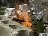 城島家の庭で繰り広げられたアウトドアクッキング。 ゆで卵は新聞紙の巻き方がポイント。 |