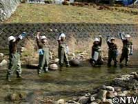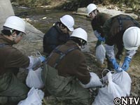 まず上流の浅い部分に土嚢を置いて水をせき止め