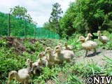 先日産まれた17羽のアイガモたちが、晴れ渡る空の下、初仕事に出た。 稲がそよぐ田んぼに、元気なパトロール隊が誕生した。 去年の先輩たちから教わるでもなく飛び出し、苗につく害虫を取るその姿は、もう一人前。 17番目に産まれた「くろすけ」も、みんなに負けじと田んぼを泳ぎまわっている。 17羽が産まれたアイガモ小屋では、また新たなるパトロール隊が誕生しようとしていた。 3羽を産んだ「さくら」も新しい卵が温められていた。楽しみな誕生までは、あとしばし。 元気なのはこちらも負けていないのが、2匹の仔ヤギたち。 母親の呼ぶ声にも耳を貸さずに、村中を駆け回っている。 足元がおぼつかなかった弟も、今では兄を追い越すまでに。 ついこのあいだまで、元気に駆け回っていた北登も、元気な2匹が気になる様子。 そして、北登がもう一つ気になっているのが、村の一角にできた果樹園。 実はこの果樹園が完成するまでには、昨年から男たちの様々な戦いがあったのです。 その話はまた後ほど…。 |