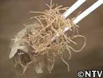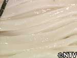 | 達也「麺といえば『そば』だよね!」 と、意気込む達也が最初に訪れたのは長野。 そう、長野といえば「信州そば」。 平安時代から山岳修験の地として有名だった長野県。 善光寺など天台宗の修行僧は主食の米、麦などの五穀を絶ち、少量の野菜と「そば」だけで荒行に耐えていた。 以来、寺院の近辺には上質のそばを食べることができるお店が存在している。 その善光寺前の参道を歩く達也。 すると、店の前に人だかりが出来ているところを発見! 近づいてみると、ガラス越しにそば打ちしている店主の姿。 その名人の手際よさに驚く達也。早速、ここで打ちたてのそばを試食! ●大丸 更級そば(¥900) ざるそば(¥700) ![]() 達也「うまい!いいロケだなあ・・・」 出された2品にご満悦の達也。 一方、香川県高松に降り立った松岡。そう、高松と言えば「讃岐うどん」。 奈良時代、遣唐使の船に乗って大陸に渡った空海が麺食文化を学び、 彼の故郷である現在の香川県にうどんを持ち帰ったとされている。 さらに上質の小麦と天然塩が多く取れたこともあり、この地にうどん文化が広まったのだという。 早速、高松市内のうどん屋に入る松岡。中では店主がうどんを打っている最中。 うどん打ちの名人技に圧倒される松岡。 すると、店主の合田さんが 「やってみますか?」との誘い。 松岡、うどん打ちに初挑戦! 麺棒一本で名人に手取り教えてもらう松岡。 松岡「おお、すごいカいるんだなあ」 そして、自ら打った麺を使って、讃岐名物「しっぽくうどん」は完成! ●番丁 しっぽくうどん(¥550) ![]() 松岡「けんちん汁みたいですねえ」 里芋・人参などの野菜が、ふんだんに乗っているしっぽくうどん。 松岡「里芋ってこれ・・・デカッ!!」 握りこぶし大の里芋に、思わずオーバーリアクションの松岡。 松岡「国分太一のリアクションを真似してみました・・・」 しかし、ここで重大なことに気付く松岡。 松岡「讃岐うどん屋さんにはうどんしかないんですか?」 店主「そうですね、小豆島に行けば素麺(そうめん)が有名なんですが」 松岡「小豆島にそうめん・・・」 一方、福島駅に降り立ったのは城島。時計を片手に、誰かを探している様子。 果たして誰を待っているのか? 待つこと10分。城島の背後から車がやってきた。 中から降りてきたのは・・・ 「こんにちは」 城島「お久しぶりです。麺言うたら鈴木さんしか思い浮かばなくて・・・」 そう、城島の助っ人として来てくれたのは、恐竜発掘プロジェクトで城島と太一がお世話になった、鈴木千里さん。 鈴木さんの職業は製麺業。これ以上にカ強い助っ人はいない。 城島「どこか、おいしい麺が食べれるところありますかね?」 鈴木「この近くに、お勧めのお蕎麦屋さんがあるんで行きましょう」 と、城島を車へと促す鈴木さん。 その車は、いつも仕事で使っている「鈴木製麺」の車。 城島「これで行くんですか?」 鈴木「行きましょうよ!」 何はともあれ、福島駅から出発した城島・鈴木チーム。 やがて、車は山の中へ・・・ 城島「なんかうまそうな蕎麦屋さんありそうな雰囲気ですわな」 鈴木「前に見えてきた、その店ですよ」 二人が訪れたのは、「御山角屋・柚っこ」というそば屋。 鈴木「私は藪そばを頂こうかな」 城島「あのー、麺料理をたくさん食べる企画なんで・・・全部下さい」 ●御山角屋・柚っこ 笙の幻そば(¥1000) 更級そば(¥800) 藪十八番(¥1000) 城島「どれも色が全然違いますね」 見た目が一番白い「更級そば」を食す城島。 鈴木さんは藪そばを試食。 「表面がすごくツルツルしてますねえ」 福島で早くも3種類ゲットした城島・鈴木チーム。快調な滑り出しだ。 その頃、長野市内でひたすら違う麺料理を求めて歩く達也。 達也「おぉ!『当店自慢の限定20食の富倉そば』だって・・・」 気になる達也。迷わず店に入ることに。 早速、富倉そばを注文する達也。しかし、 店主「すいません、もう売切れてしまいまして・・・」 達也「え!本当ですか!・・・なんか他に変わったそばありますか?」 店主「今月はゴマを擦り込んだそばを出しておりますが」 達也「あ、ではそれを頂けますか」 なんとか「ごま入りそば」だけは食べられる。 しかし、気になる「一日20食限定の富倉そば」。 すると、隣りの席には「富倉そば」を食べるご婦人の姿が・・・ 食指ならぬ、食足は隣りの席へ。 達也「あのー、この『ごま入りそば』非常においしいんですよ、ちょっと交換しませんか?」 と、ご婦人と交渉。すると、快くOK! ここで2種類ゲット! ●富倉家 富倉そば(¥1500) ごま入りそば(¥1300) 一方、宮城県白石市に北上した城島・鈴木チーム。 ここで「白石うーめん」という麺料理を発見! 二人が食べた「味三種うーめん」は、冷たいうーめんをゴマ、クルミ、醤油の3種類のつけだれにつけて食べる。 そして、茹でたうーめんを鳥で出汁をとった鍋に泳がせて温かくして食べる「鍋うーめん」も賞味。 しかし、調理は違えど麺は一緒のもの。二つ食べてもここで