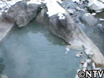 続いて岐阜県に突入した達也。積雪は2mを超え、もはや車の高さ以上。 さらに奥地の山々を登った先で、 ついに天然の巨大石で周りを囲まれた秘湯を発見した。 未だに自然の残っている渓谷をバックに湯に浸かる達也。 あまりの気持ち良さに、思わず岩に乗り出しガッツポーズで一言・・・。 達也「ホイ 来た!!」