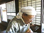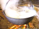 一方、明雄さんは囲炉裏端で黒鯛を捌いて、アラも身もまるごと入れた鍋を作っていた。