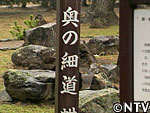 その頃、象潟町・蚶満寺では猫とじゃれあう2人の男たちの姿があった。 太一と長瀬だ。猫に別れを告げ、待ち合わせ場所へと向かう。すると、 太一「すごいもの見つけた」 それは、一本の木柱、そこには“奥の細道”と記されている。 2 人がさらに細道を進むと、あの松尾芭蕉の銅像が建っていた。 松尾芭蕉は奥の細道の旅の際、ここ蚶満寺を最北端に日本海を南下したのである。それは、2人の目指す道と同じだった。